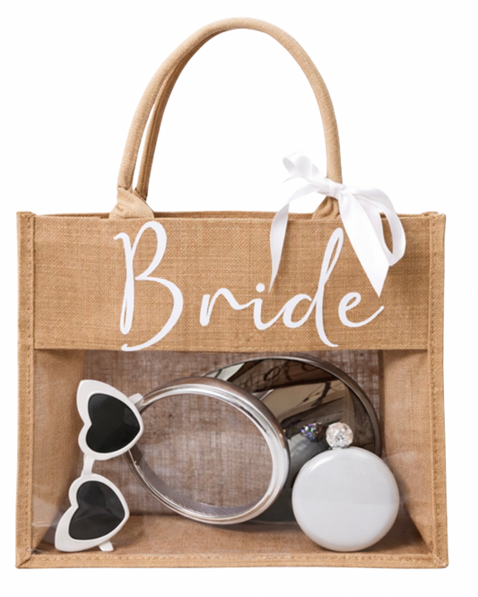 Bolsa tote bag de yute con transparencia enfrente con frase y listón de moño (no incluye accesorios). Entrega de 15 a 20 días hábiles.