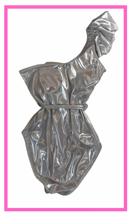 ENTREGA DE 15 A 20 DÍAS HÁBILES. Traje de baño off shoulder con olan en tirante con fajito color blanco glitter con frase Bride yo Be color dorado.